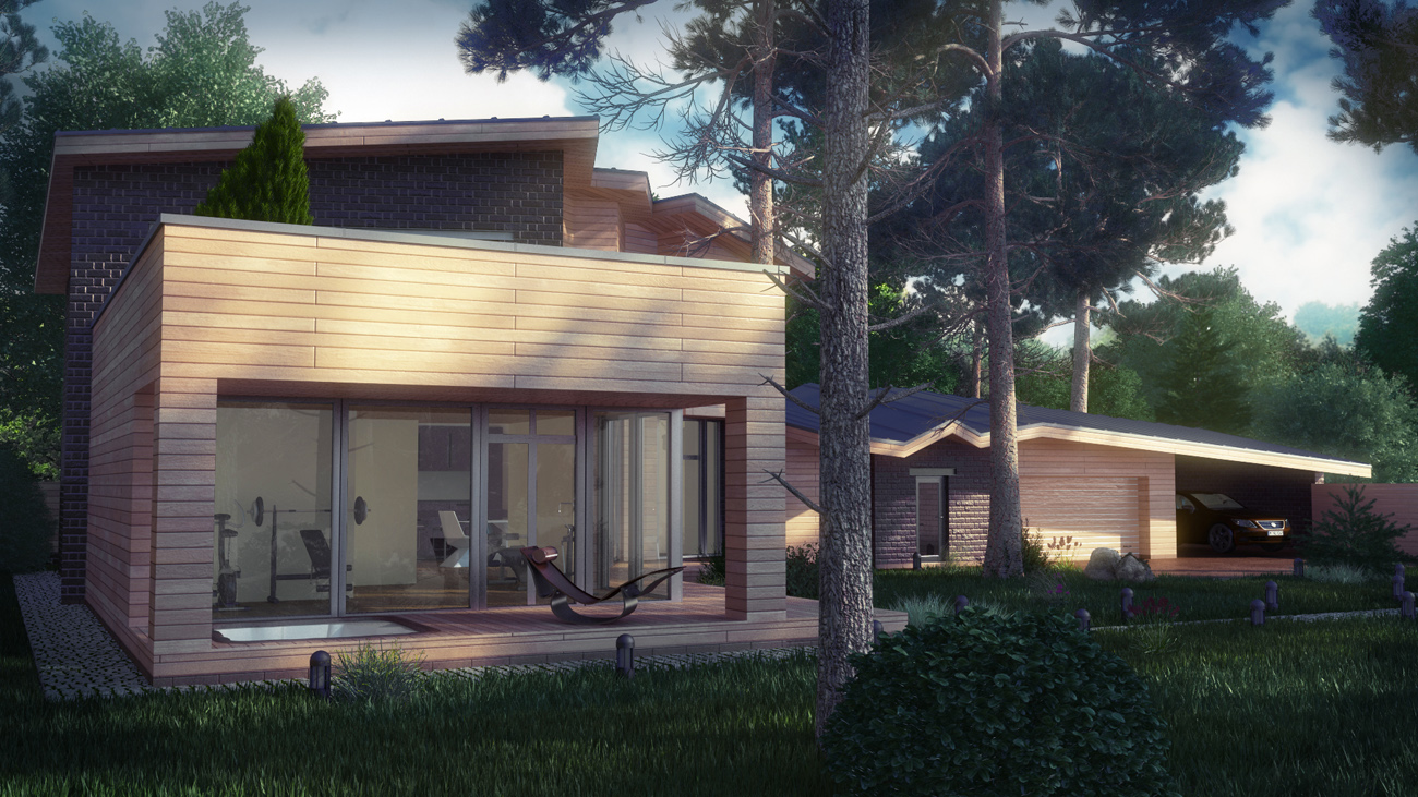 Просторный, открытый в сторону участка дом. Основа композиции - два одноэтажных крыла и двухэтажный угловой объем между ними.