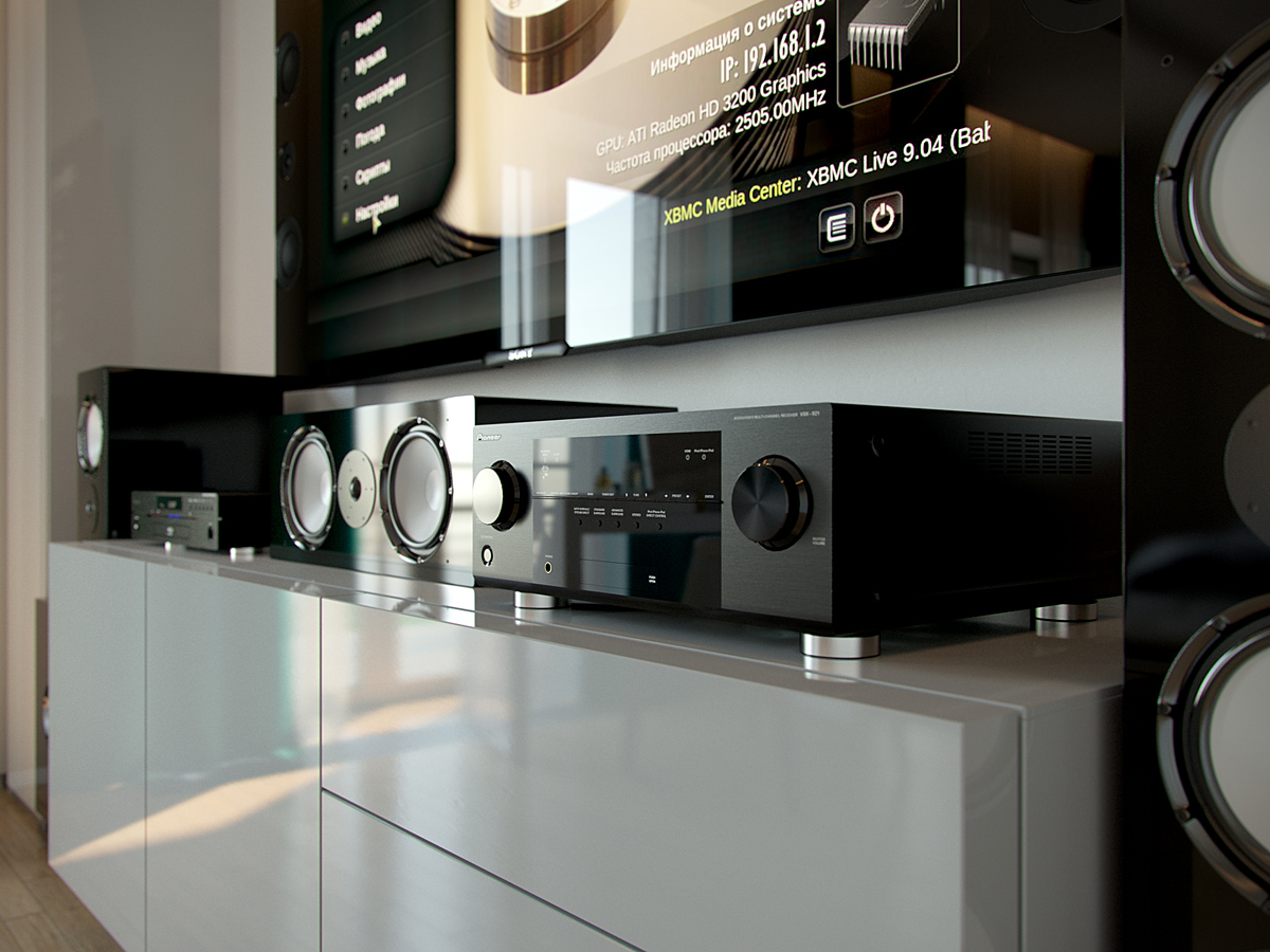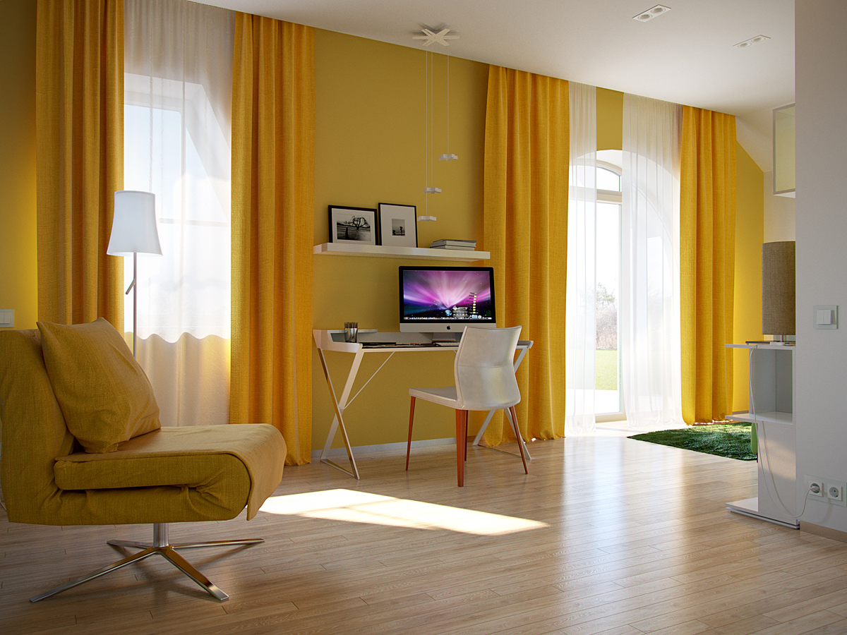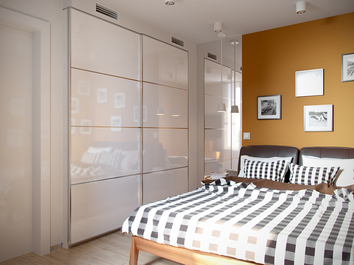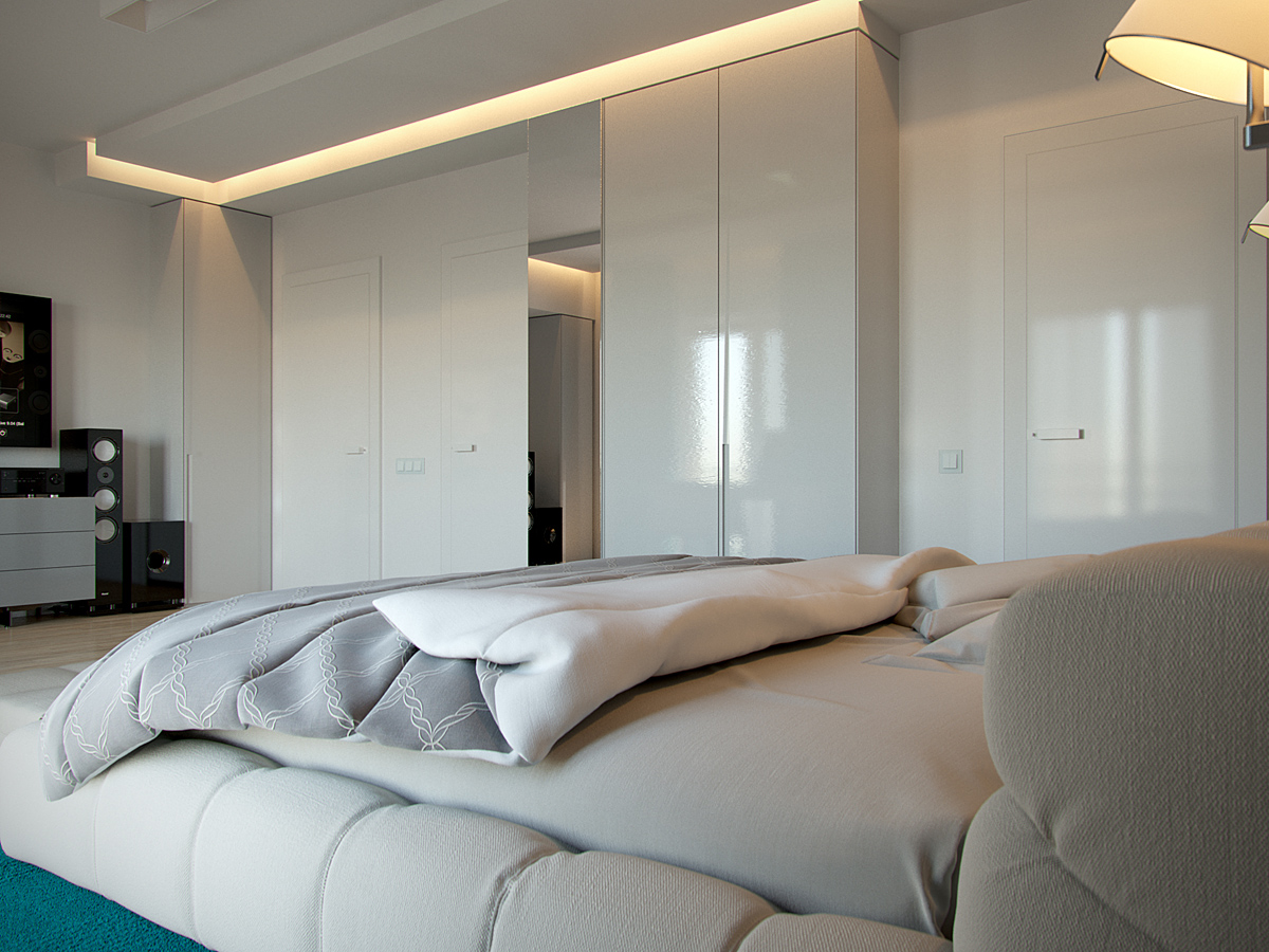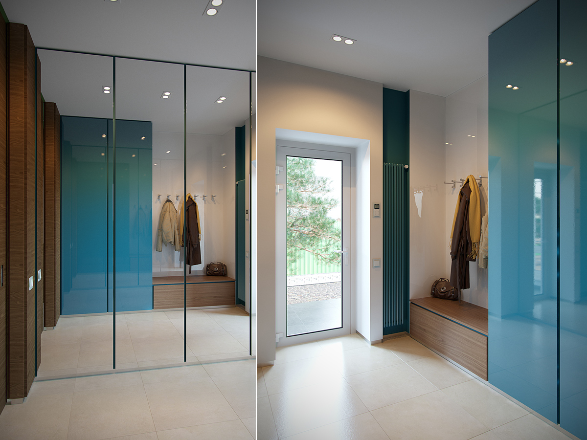Колористическое решение построено на сочетании истинно минималистического белого, разнообразных фактур натурального дерева, спокойных теплых оттенков натуральной кожи мебели и ярких зеленых акцентов.